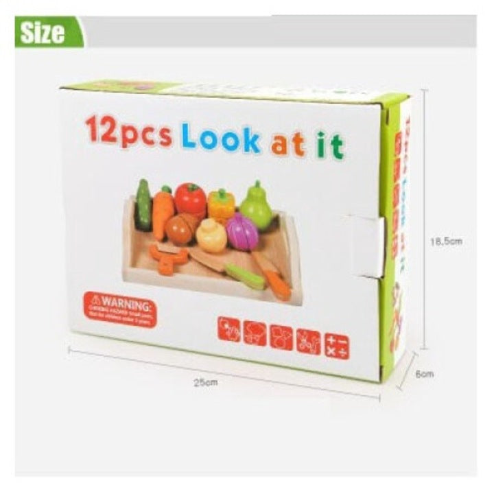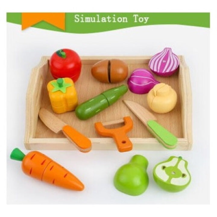 Set Montessori 12 Piese MSN, Tavita cu legume si fructe de taiat, din lemn