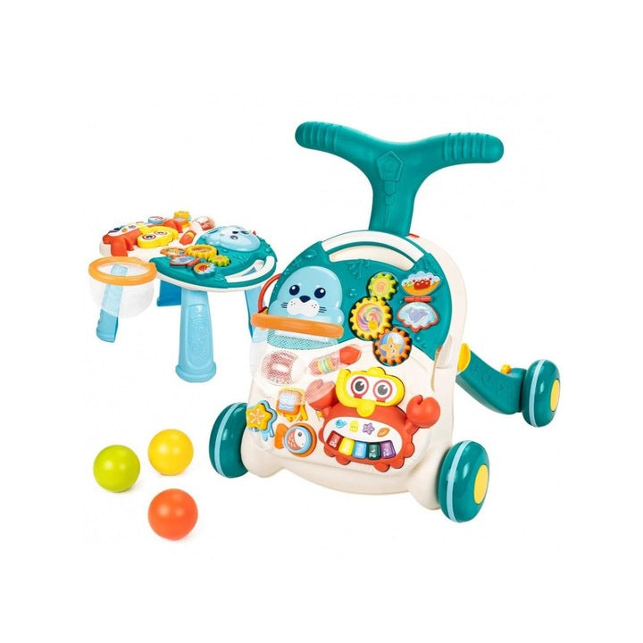 Produsul pe care il prezentam combina functiile unui impingator, masa educativa, panou, baschet si pian. Impingatorul, pe care il recomandam tuturor copiilor cu varsta peste 12 luni, este un asistent excelent pentru a invata sa mearga independent. Walkerul este proiectat avand in vedere cei mai mici copii, ceea ce garanteaza constructia si productia in conditii de siguranta din materiale sigure si de inalta calitate. Folosirea acestuia in timp ce te distrezi ajuta la invatarea mersului independent.Daca doriti ca copilul dvs. sa se joace la locul sau, puteti bloca rotile din spate.Roti cu un tampon din silicon antiderapant, datorita caruia walker-ul nu aluneca pe placi sau panouri si nu le zgarieCe se ascunde in acest desktop interactiv? Un pian multicolor in forma de crab de jucat este util in invatarea sunetelor scalei de solmizare, constand din taste colorate marcate cu o fraza. Deasupra sunt 4 animale marine - fiecare tasta ascunde o melodie vesela diferita. Trei rafturi care se pun in miscare intre ele Forme geometrice colorate pe siruri care pot fi ajustate intre ele si apasa, Scoica este o mini carte cu poze Coș cu trei mingi Roata rotativă cu bila Calamar cu 4 discuri - poate fi folosit ca abac Contine un pian in forma de crab care contine multe sunete si melodii. Este o jucarie independenta care poate fi jucata in afara impingatorului. delfin: 3 sunset-uri scurte caracatita: 6 melodii stea de mare: sunete ale unor tonuri de apel diferite midie: 5 melodii.Cand un copil se plictiseste de mers, impingatorul poate fi transformat rapid intr-o masa educativa! Picioarele sunt incluse in set.Un sigiliu cu un cos de baschet in gura (setul include 3 bile de aruncare colorate, zgomotoase). Baschetul poate fi atasat la masa, precum si la impingator Plimbarea prezentata cu panoul educational afecteaza nu numai invatarea de a merge, ci sustine si dezvoltare lingvistica, senzoriala si motorie a bebelusului si, de asemenea, preda. Walker-ul educational cu o placa de sunet interactiva este foarte usor de utilizare si de asamblat. Jucaria este ambalata intr-o cutie mare, estetica, deci este potrivita ca un cadou.Dimensiunile ambalajului: 68,0 x 11,0 x 39,0 cm Dimensiuni crab: 18,0 x 13,0 x 3,5 cm Dimensiunile impingatorului: 42,0 (fata 37 cm) x 42,0 x 43,0 cm Dimensiuni panou: 31,0 x 28,0 cm Lungimea mesei: 21,5 cm