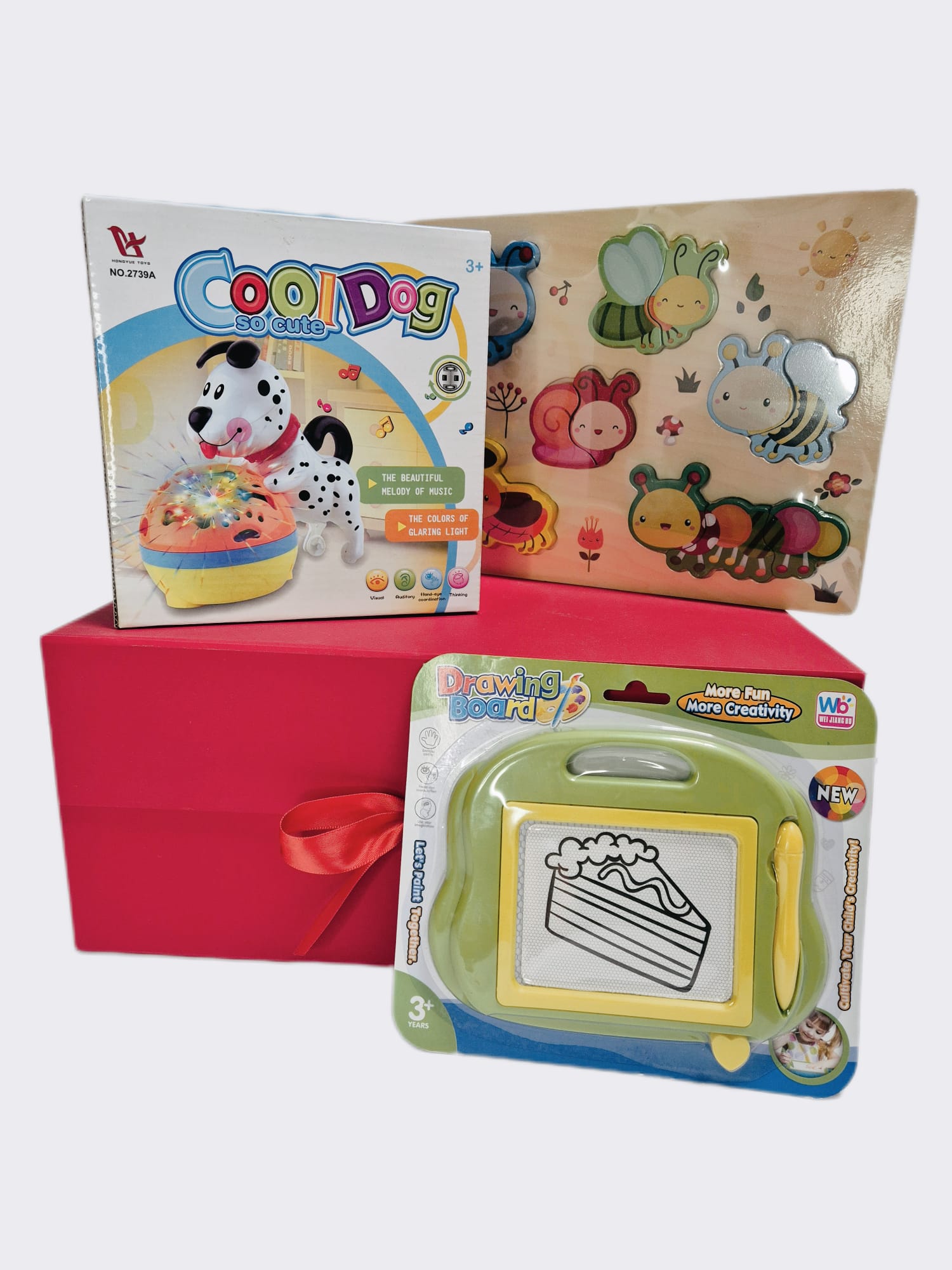 🧠 Stimulare Completă: Combină puzzle-ul (logică și motricitate), jucăria muzicală (senzorial) și tăblița de desen (creativitate).