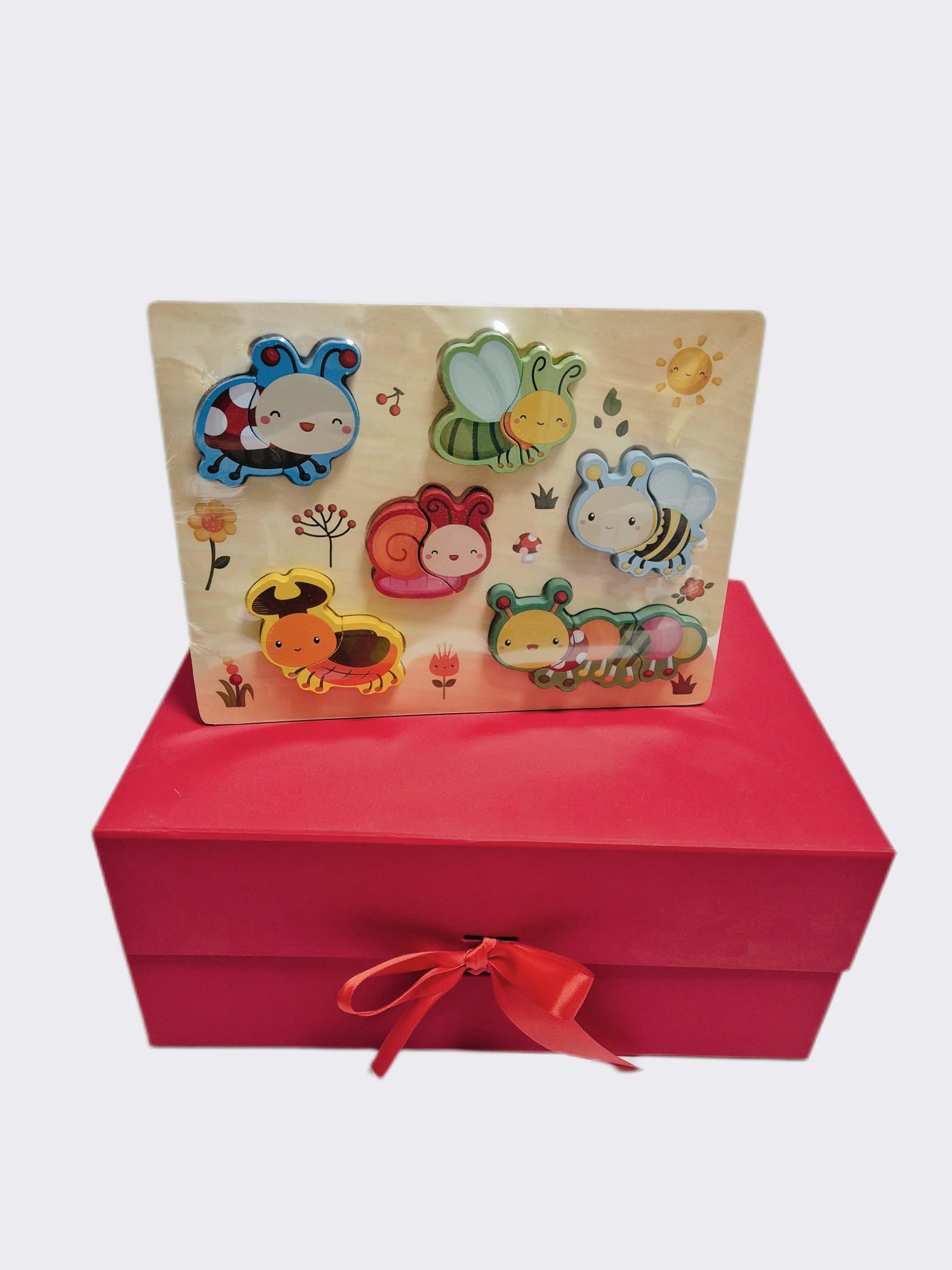 1. Puzzle din Lemn cu Insecte Vesele: Un puzzle adorabil cu piese mari, ușor de apucat, reprezentând insecte prietenoase. Ajută la dezvoltarea motricității fine, a recunoașterii formelor și a dezvoltării logice.