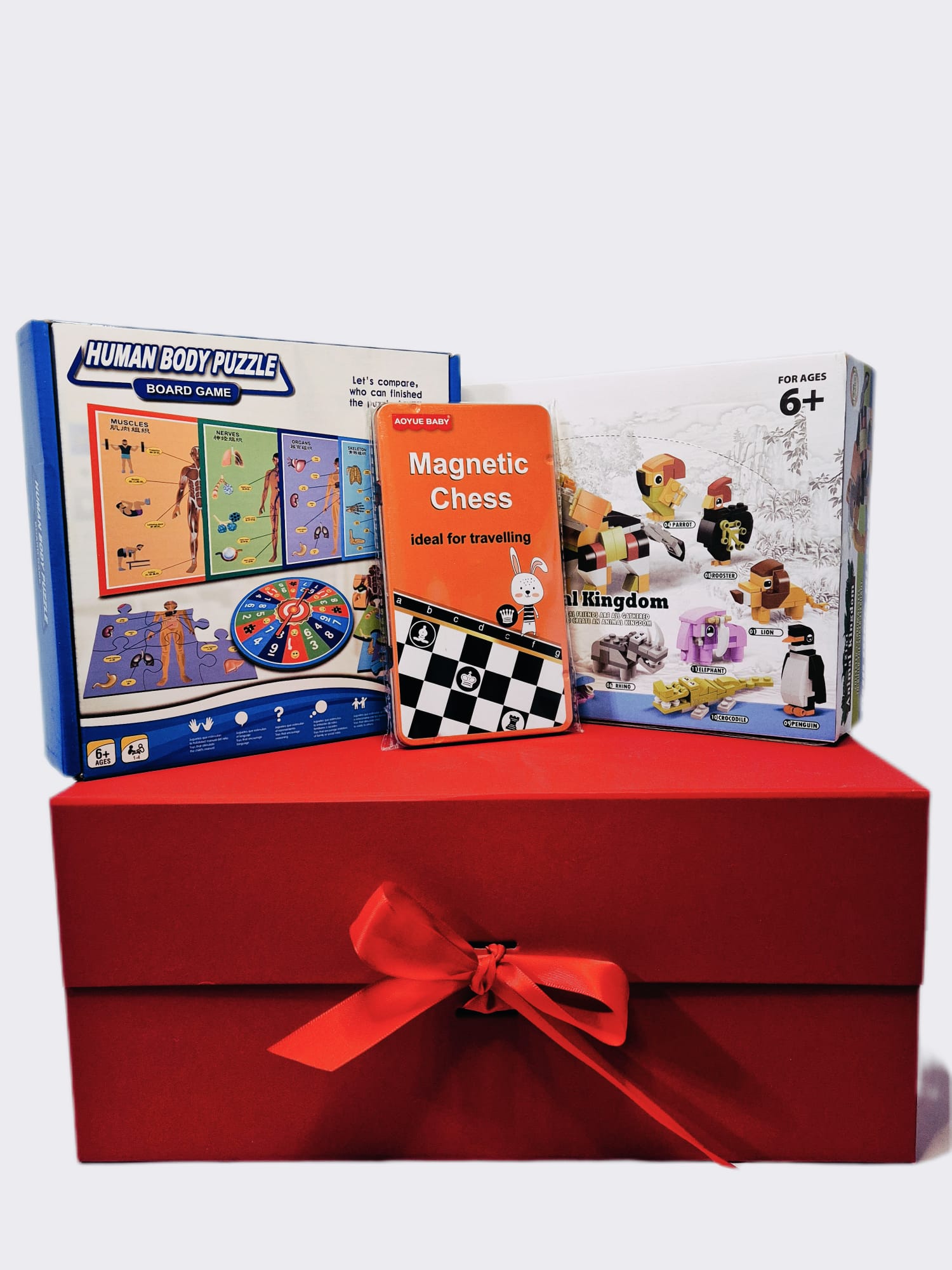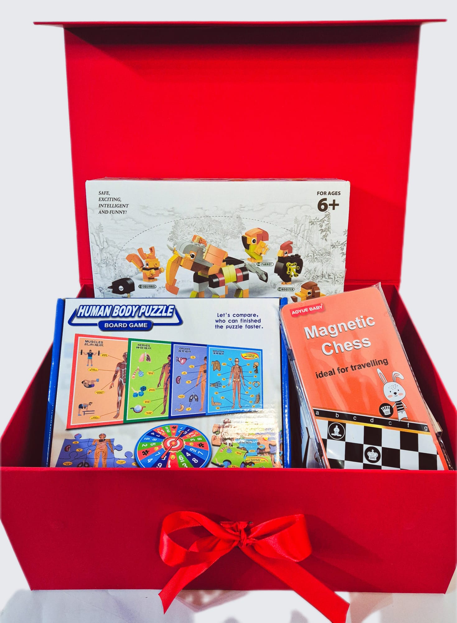 Ambalat cu grijă într-o cutie elegantă roșie cu fundiță, acest set este alegerea ideală pentru un cadou de Crăciun memorabil – educativ, vesel și plin de magie! 🎅✨