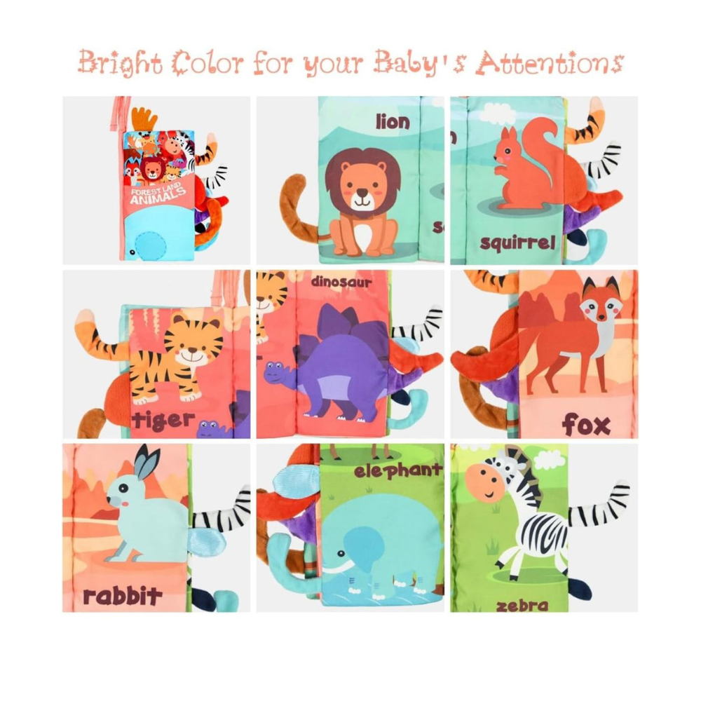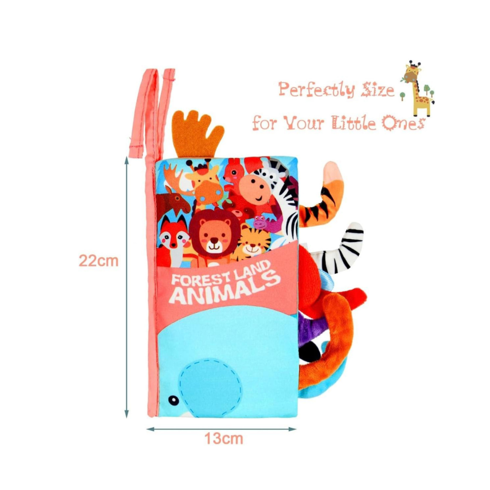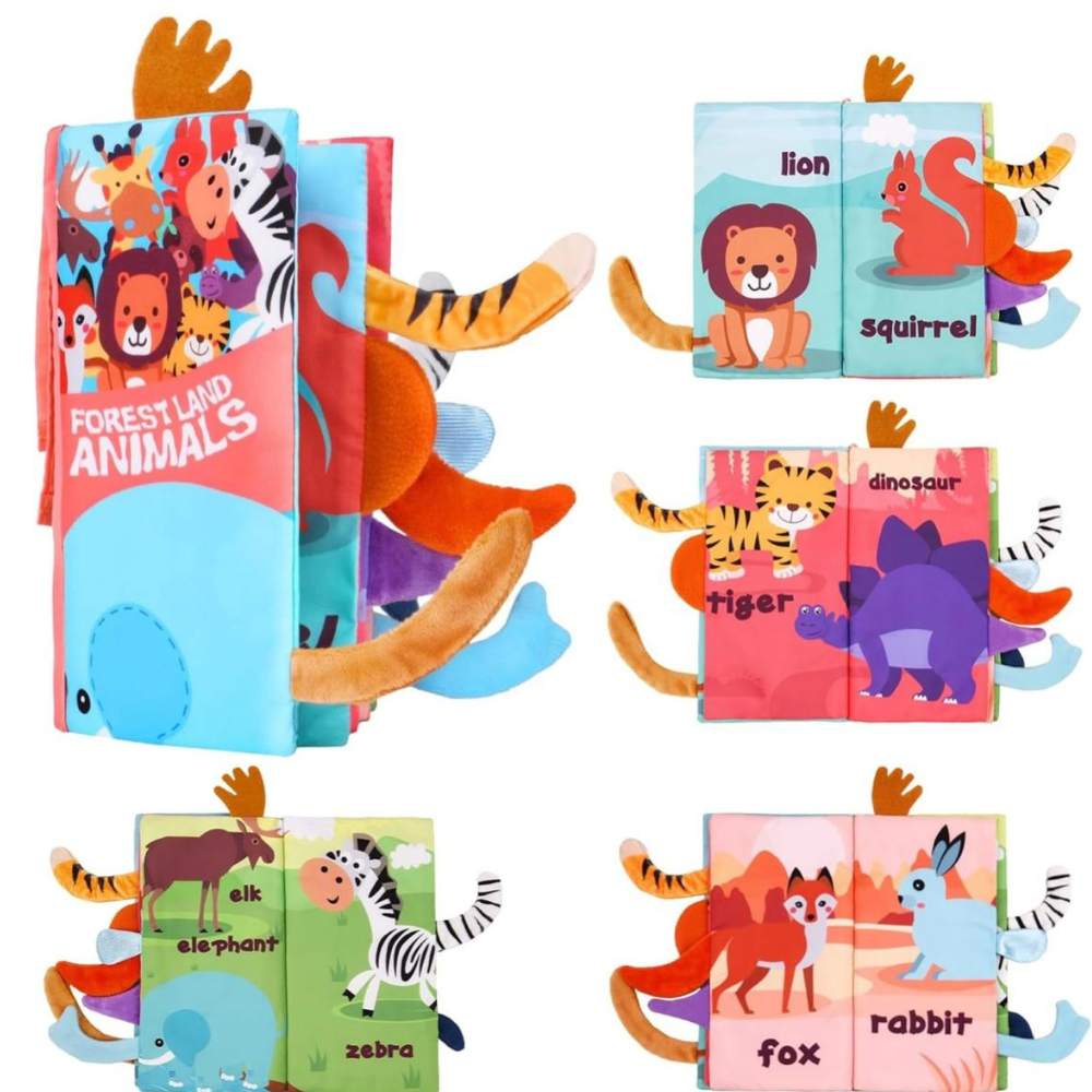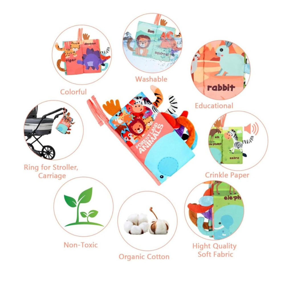 Descriere: Acesta este un produs pentru bebelusi, o jucarie textila, destinat copiilor cu varsta de peste 3 luni. Textura moale, sigura pentru copii, non-toxic. Caracteristici: Design colorat si prietenos pentru atrage atentia copiilor. Elemente interactive precum texturi diferite, zgomote sau jucarii atasate (posibil sunete la atingere sau suieratoare). Jucaria promoveaza interactiunea parinte-copil. Beneficii: 1. Dezvoltarea senzoriala: Cartile textile ajuta la stimularea vizuala, tactila si auditiva a bebelusilor. 2. Coordonarea maini-ochi: Copiii sunt incurajati sa atinga si sa exploreze diferitele texturi. 3. Cunosterea primelor concepte: Animale si culori simple.