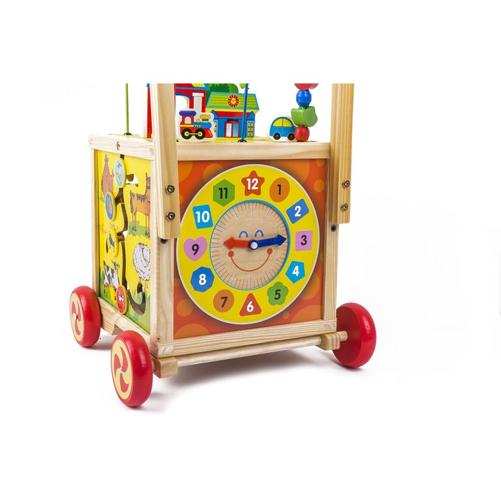 - fiind dotat cu roti si maner, poate fi utilizat ca antepremergator de catre bebelusi sau ca jucarie de impins, de exterior de catre copilasii mai mari. In momentul in care bebelusul / copilul oboseste, poate lua o pauza explorand celelalte activitati ale cubului din lemn;