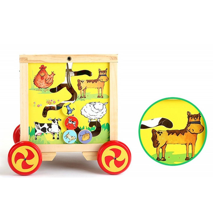 - labirint din lemn cu animale in format 3D - include piese care reprezinta animale si se gliseaza pe canalele unui labirint. Copilul trebuie sa mute animalele pe canalele labirintului si sa le potriveasca corect langa imaginea corespunzatoare. Pe placa din lemn sunt realizate desene iar fiecare piesa trebuie sa fie aranjata corect linga imaginea sa;