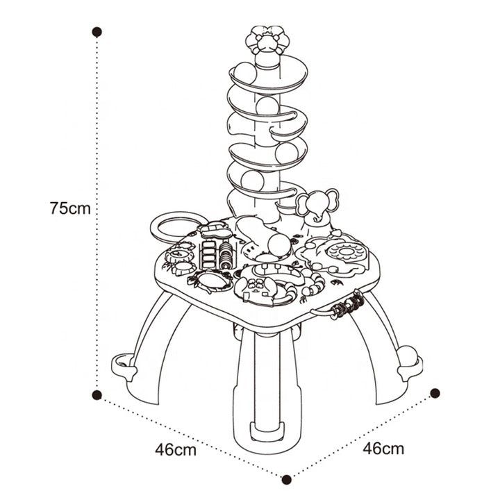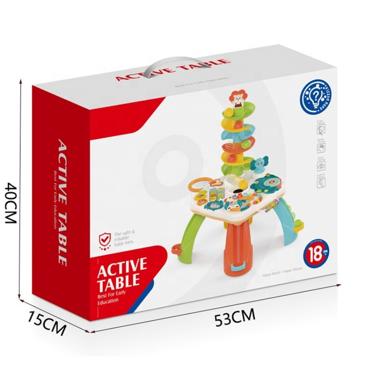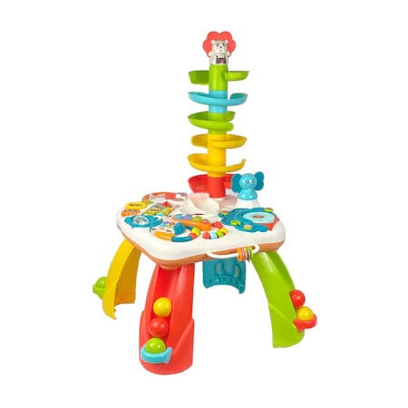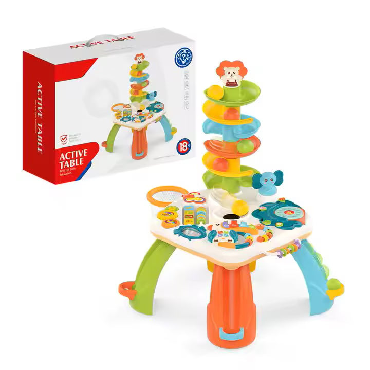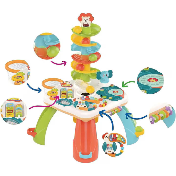 Joaca inteligentă: dezvoltare cognitivă prin activități captivante Fiecare element de pe aceasta masuta a fost gandit cu scopul de a sustine dezvoltarea cognitiva a copilului: Jocul cu bilele colorate care ruleaza pe un tobogan in spirala ii ajuta pe cei mici sa inteleaga cauzalitatea, gravitatia si sa isi antreneze rabdarea. Jocurile mecanice cu roti zimtate dezvolta gandirea logica si invatarea secventiala – copiii observa ce se intampla cand rotesc un element si cum interactioneaza intre ele piese. Formele si culorile sunt introduse prin jocuri vizuale interactive, ajutand copilul sa le recunoasca si sa le asocieze mai usor.Pianul in forma de tucan colorat este vedeta masutei. Acesta: Reproduce notele Do, Re, Mi, Fa pentru familiarizarea cu sunetele muzicale; Emite sunete si cantece vesele care atrag atentia copilului si il introduce in lumea muzicii; Dispune de lumini sincronizate cu sunetele, care stimuleaza perceptia vizuala si auditiva in acelasi timp; Are doua moduri de functionare: lumina + sunet sau doar sunet (mod silentios) – ideal pentru joaca in diferite momente ale zilei.