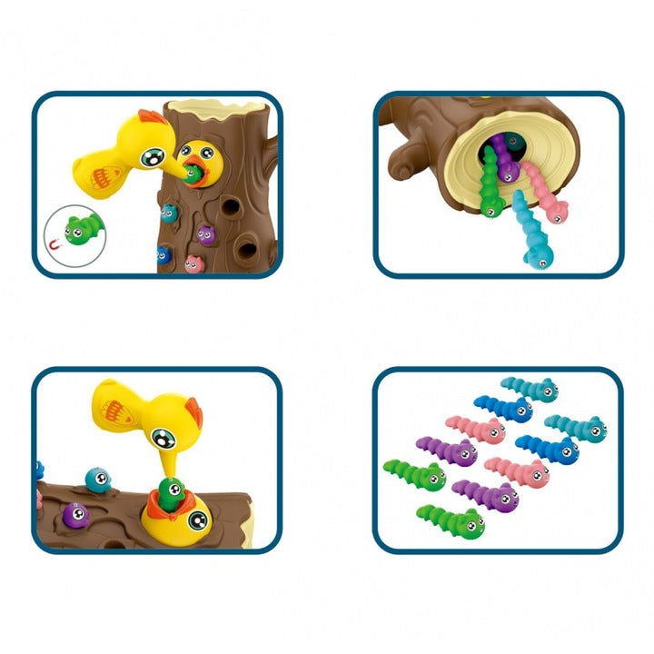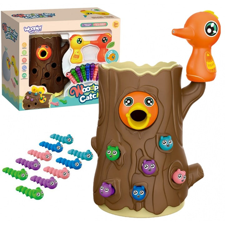 Jocul de indemanare Worm Catch de la WOOPIE este o modalitate excelenta de a petrece timp impreuna cu copilul tau. Regulile simple si operarea intuitiva fac posibil ca aproape toata lumea sa se joace. Jocul consta in prinderea viermilor ascunsi in gaurile copacului cu un magnet cu varful unui magnet si apoi punerea lor inapoi in ciocul pasarii , pui si 10 viermi. Doi copii se pot juca cu setul in acelasi timp . Jocul invata in timp ce te distrezi - va ajuta la dezvoltare, printre altele. abilitati motorii (de miscare) si vizuale . Jucaria este destul de o provocare pentru copil mic, necesita concentrare si dexteritate manuala, dar il va face pe copil extrem de interesat. Caracteristici: - o jucarie de la varsta de 3 ani - un joc de indemanare magnetica - setul poate fi jucat de doi copii in acelasi timp - preda distrandu -se - va ajuta la dezvoltare, printre altele. abilitati motorii (de miscare ) si vizuale Include: - 2x copii mici - un bustean cu un pui - 10 viermi