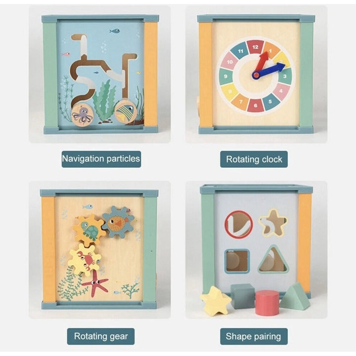 Cub educativ din lemn Kabi Ocean 5 in 1 Activity Cube- Activitati pentru copii intr-un cub frumos, pastel, culori nordice