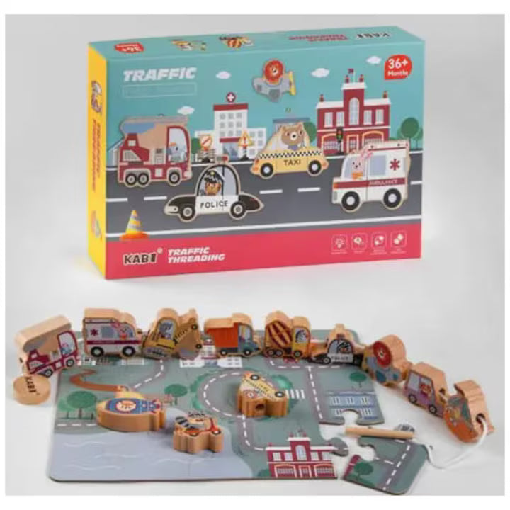 Contine margele din lemn sub forma de masini, autobuze, trenuri si alte vehicule, precum si un puzzle tip drum pe care copiii il pot construi.