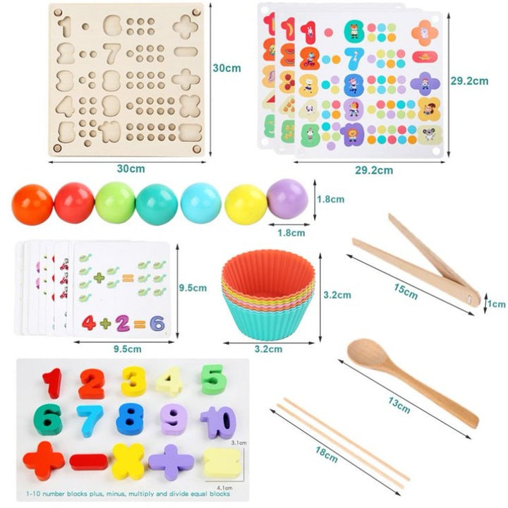 Tabla din lemn tip Montessori este colorata in nuante vesele, insotita de bile si cifre, piese prin care transforma operatiunile de socotire intr-o activitate distractiva.