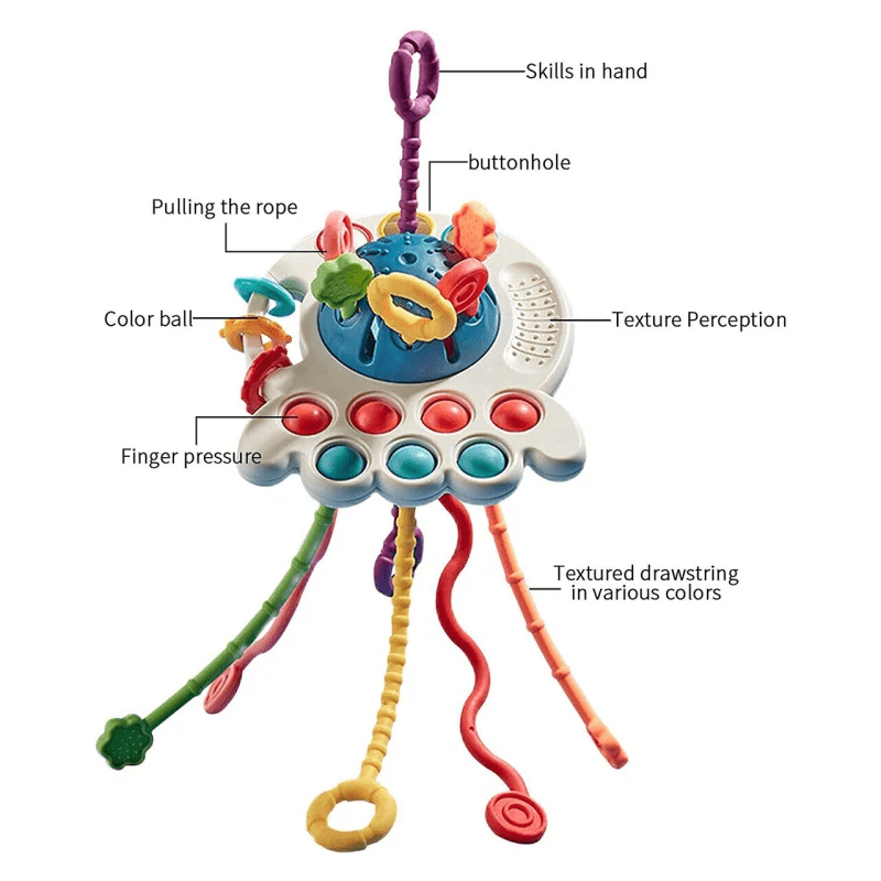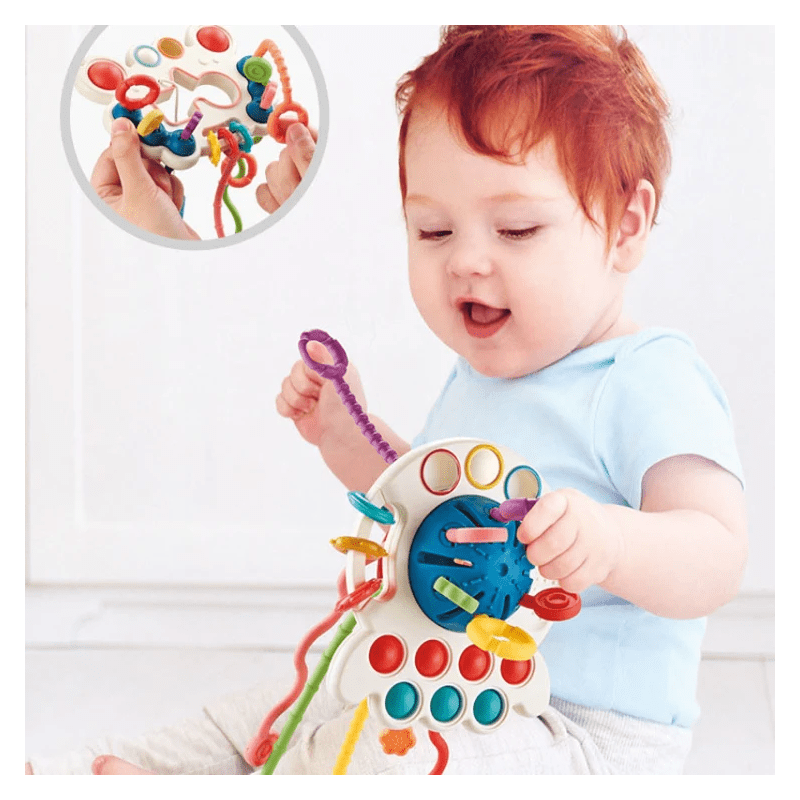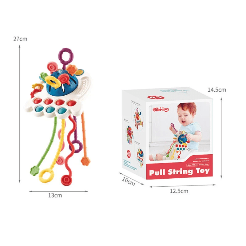 In plus, sirurile din silicon vin in culori diferite si au o varietate de texturi . Iar jocul cu ei presupune sa le taresti dintr-o parte in alta. Sarcina pare simpla, dar pentru un copil mic poate fi o provocare!