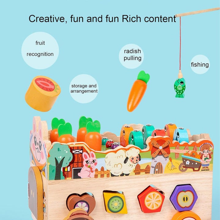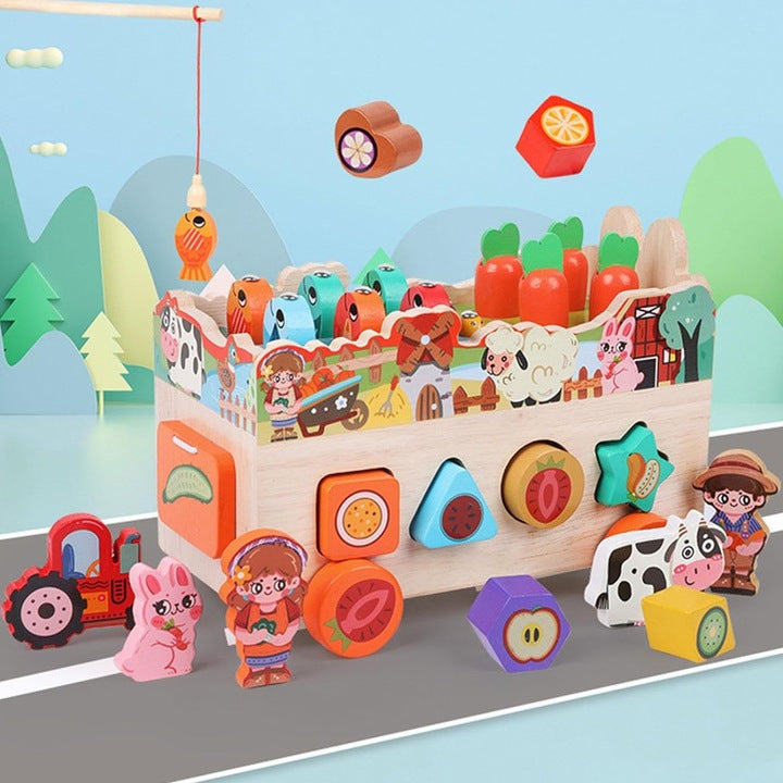 Jucaria Educativa din Lemn cu Functii Multiple, inclusiv Carucior Sortator si Pescuit Magnetic, este o solutie excelenta de invatare interactiva pentru copii. Aceasta jucarie polivalenta combina mai multe activitati educationale intr-un singur design plin de culoare si interes, destinat dezvoltarii abilitatilor motorii si cognitive ale copiilor.