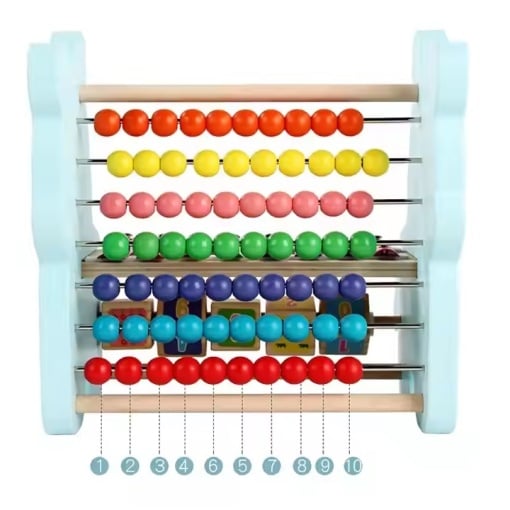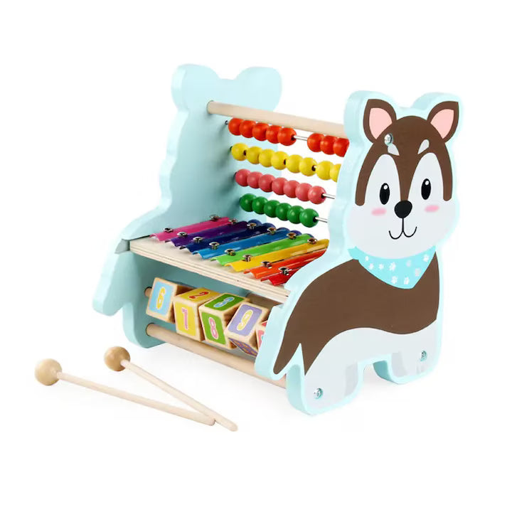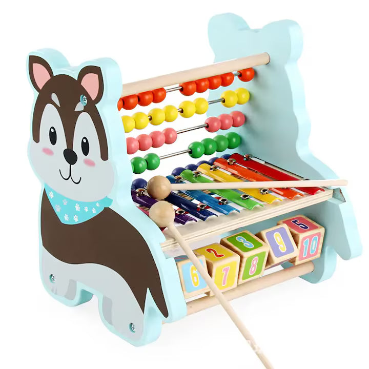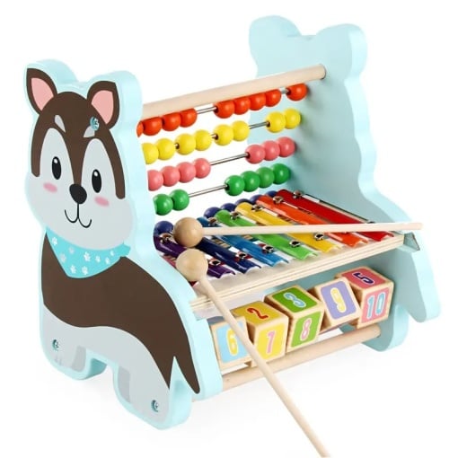 Jucaria include o numaratoare traditionala cu bilute colorate care ajuta copiii sa invete sa numere si sa recunoasca culorile. De asemenea, xilofonul multicolor adauga o componenta muzicala, permitand copiilor sa isi exprime creativitatea si sa exploreze sunetele si ritmurile muzicale, dezvoltandu-si astfel abilitatile auditive si ritmice.