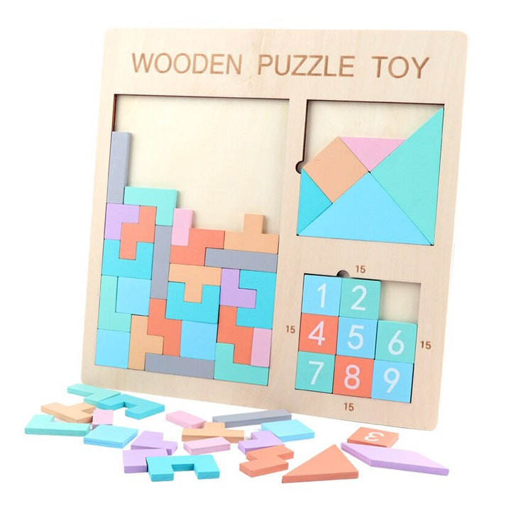 Puzzle-ul consta din 3 puzzle-uri logice diferite: Tetris, Tangram si Numbers. Setul include blocuri multicolore care pot fi aranjate in orice mod. Un copil poate crea aproape orice - trebuie doar sa se gandeasca sau clipa si sa planifice aranjarea elementelor.
