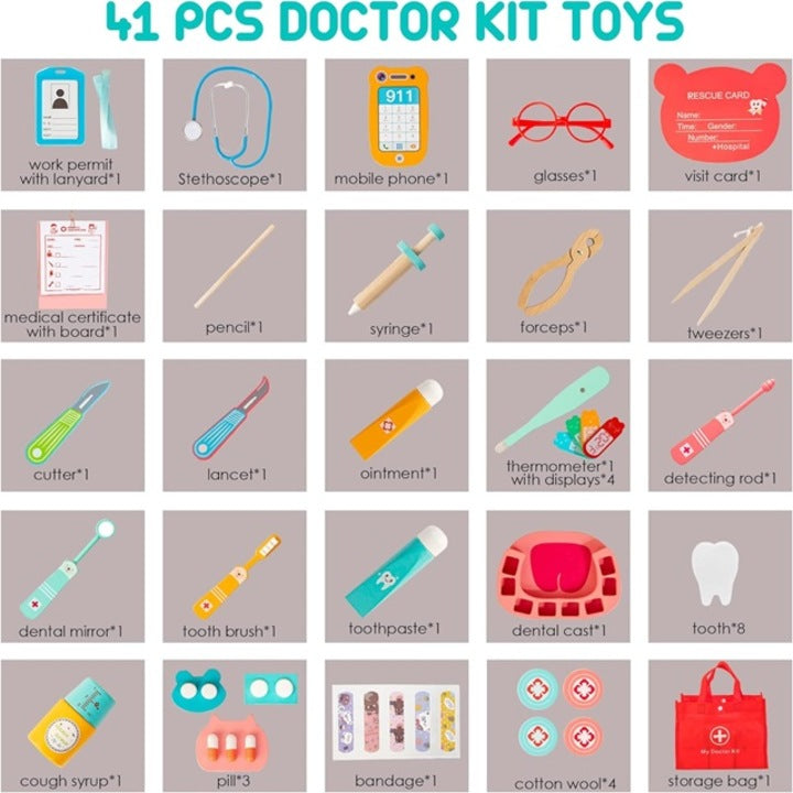 Bun venit in lumea fascinanta a jocului de rol medical cu trusa noastra de jucarie din lemn! Aceasta trusa adorabila si colorata contine tot ce un viitor medic ar avea nevoie pentru a incepe o aventura plina de ingrijire si descoperiri medicale.